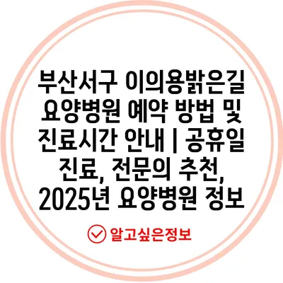 부산서구 이의용밝은길 요양병원 예약 방법 및 진료시간 공지 | 공휴일 진료, 전연락 추천, 2025년 요양병원 정보 에 대해 자주 묻는 질문 TOP 5