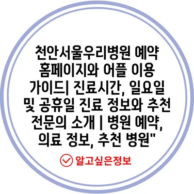 천안서울우리병원 예약 홈페이지와 어플 이용 가이드| 진료시간, 일요일 및 공휴일 진료 정보와 추천 전문의 소개 | 병원 예약, 의료 정보, 추천 병원”