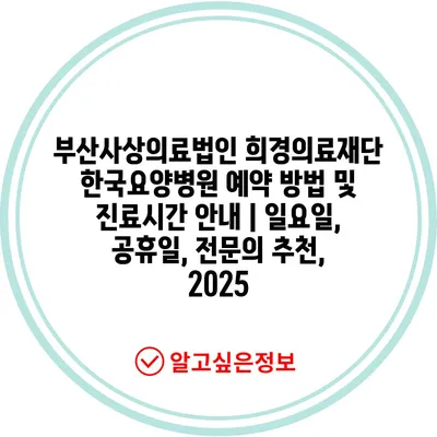 부산사상의료법인 희경의료재단 한국요양병원 예약 방법 및 진료시간 안내 | 일요일, 공휴일, 전문의 추천, 2025