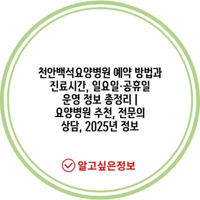 천안백석요양병원 예약 방법과 진료시간, 일요일·공휴일 운영 정보 총정리 | 요양병원 추천, 전문의 상담, 2025년 정보