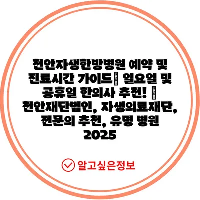 천안자생한방병원 예약 및 진료시간 가이드| 일요일 및 공휴일 한의사 추천! | 천안재단법인, 자생의료재단, 전문의 추천, 유명 병원 2025