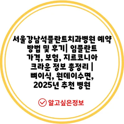 서울강남석플란트치과병원 예약 방법 및 후기| 임플란트 가격, 보험, 지르코니아 크라운 정보 총정리 | 뼈이식, 원데이수면, 2025년 추천 병원