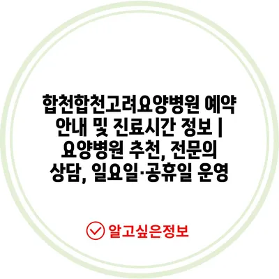 합천합천고려요양병원 예약 안내 및 진료시간 정보 | 요양병원 추천, 전문의 상담, 일요일·공휴일 운영