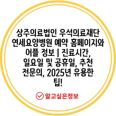 상주의료법인 우석의료재단 연세요양병원 예약 홈페이지와 어플 정보 | 진료시간, 일요일 및 공휴일, 추천 전문의, 2025년 유용한 팁!