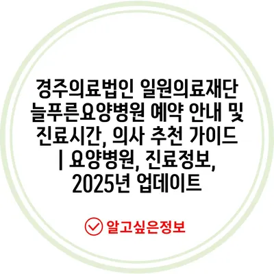 경주의료법인 일원의료재단 늘푸른요양병원 예약 안내 및 진료시간, 의사 추천 가이드 | 요양병원, 진료정보, 2025년 업데이트