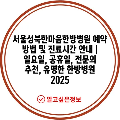 서울성북한마음한방병원 예약 방법 및 진료시간 안내 | 일요일, 공휴일, 전문의 추천, 유명한 한방병원 2025